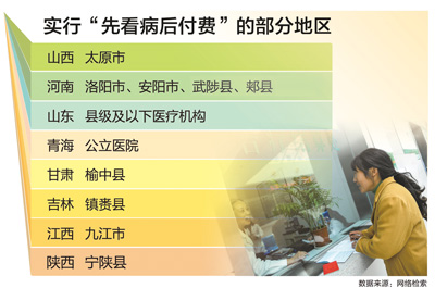 自2012年以来,山东、青海、河南等地推出“先看病,后付费”试点,深受百姓欢迎。目前,全国已经有20多个省份开展“先住院,后付费”试点,基本是在县级医院,主要针对新农合病人。其做法是:参加新农合的患者住院可不交押金,待出院时只需交纳全部医疗费用中个人自付部分,报销部分由医院与新农合机构结算。